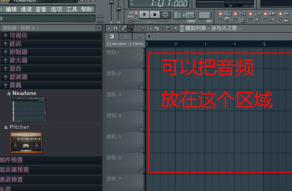 第二步,打开之后我们会看到FL studio 的界面,这里有好几个区域,我们可以关闭多余的区域界面,然后接下来我们可以把音频放在音轨区域里面。