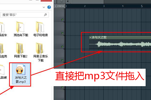 第三步,我们打开mp3音频文件所在的文件夹,用鼠标点击音频文件,按住拖动,直接把mp3文件拖入FL studio 音轨界面当中。