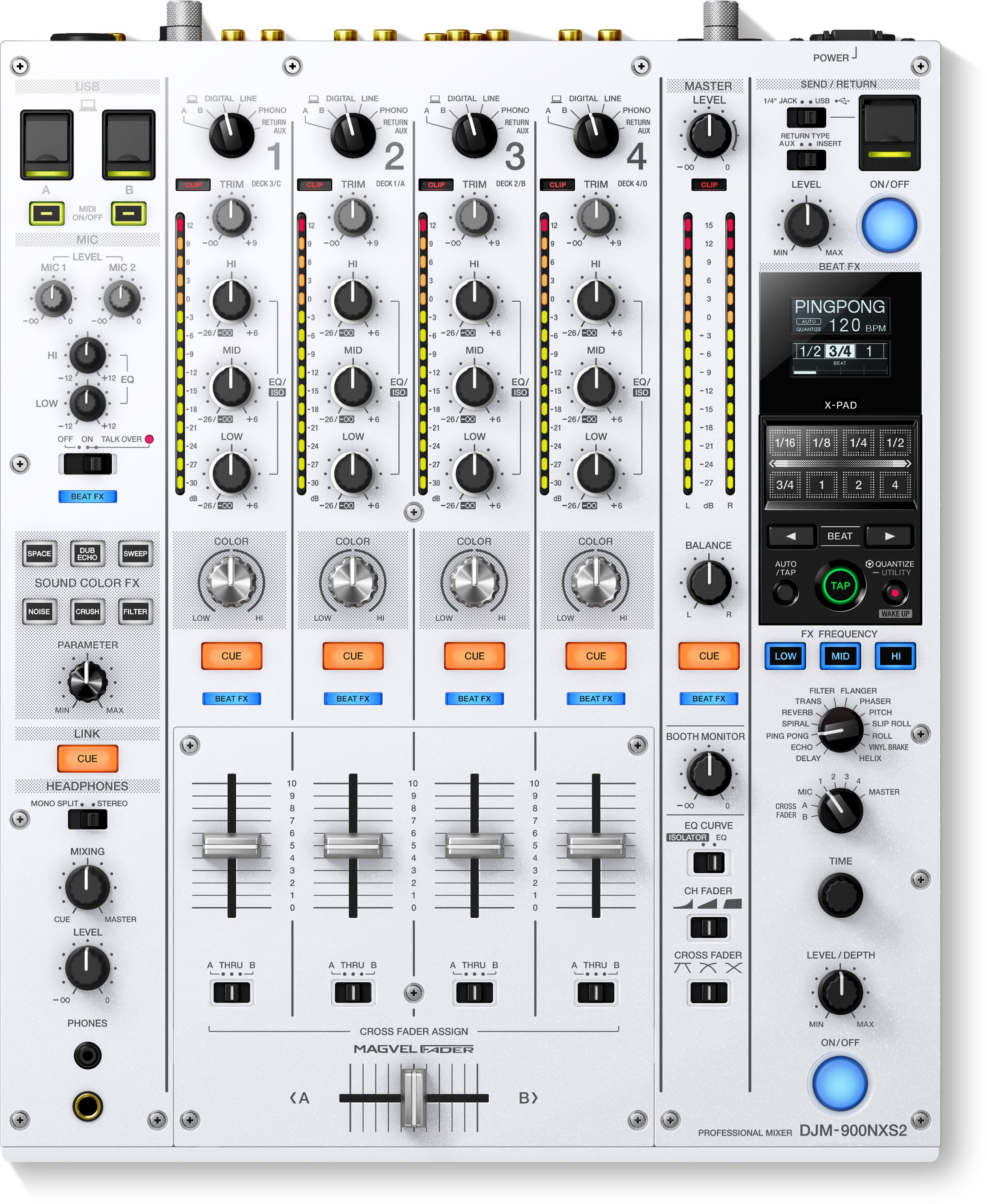 图片介绍:使用DJM-900NXS2将您的性能提升到新的高度,DJM-900NXS2采用我们的首款64位混音处理器,可提供更温暖,更细致的声音。我们对EQ和推子曲线进行了微调,并增强了FX控制,为您提供更多创意选择。此外,多功能DJM-900NXS2具有独立的发送/返回,4个唱机输入和2个USB端口 - 让您可以灵活地设置自己的方式。