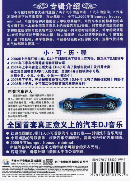 小可在打制本套大碟时遵循了两个汽车的基本点:1.汽车的空间;2.汽车不同情况下的节奏需要。在此基础上,小可从2000多首lounge、house、minimal、串烧等各种风格的音乐中吸取其精华,用汽车本有的标准性的声音点缀打制出本套全国真正意思上的首套汽车DJ音乐。对节奏的深层次的追求和细化使你惊奇的发现本套DJ可满足不同驾驶时刻的需求,简单的说就是DJ音乐居然还能舒缓您的心情!骇人听闻吧!总之能感受到的是,引擎在摇滚;油门在狂吼;刹车在协奏;雨刮器轻轻有安抚你的心灵;连排气管的气体都是那么悦耳........
